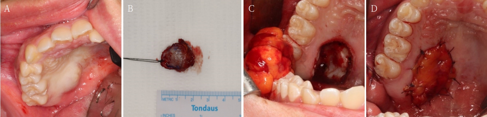 A 26-year-old female patient was referred to our clinic for definitive diagnosis and treatment due to bulging lesion on the right posterior palatal region. The patient reported being aware of the lesion for approximately one month. Notable swelling was observed in the right posterior hard palate. Upon palpation, a firm swelling exhibiting slight elasticity was noted, without any evidence of fluctuation. The lesion did not extend beyond the palatal midline and measured approximately 2.5 cm x 2 cm x 2 cm. There was no color change on the overlying mucosa and the surface of the lesion was smooth without ulcers (Fig. 1A). It revealed no pain, and aspiration yielded no content. Adjacent teeth showed no clinical features such as pain or discomfort, and the palate involving the lesion exhibited no sensory abnormalities.