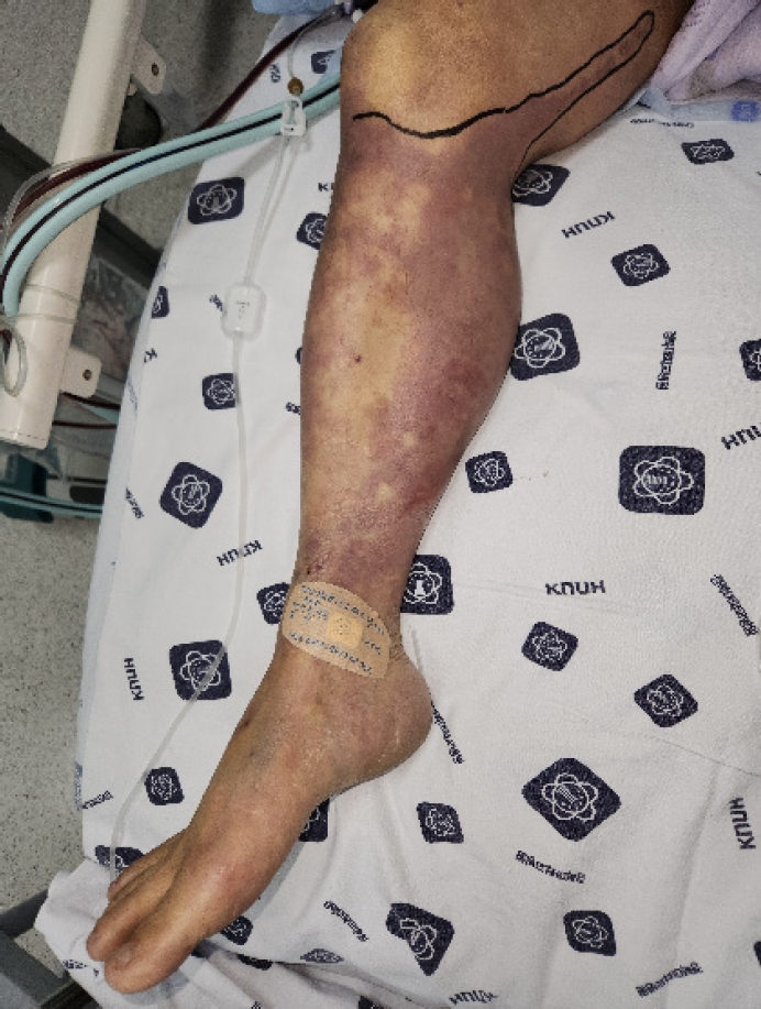 A 55-year-old man with a history of dyslipidemia and fatty liver presented to Kyungpook National University Hospital emergency center on May 10, 2023, with complaints of abdominal pain and vomiting that began the day prior. The patient reported significant alcohol consumption, including two bottles of alcohol daily for the past month and at least one bottle per meal over the previous 10 days. Initial laboratory evaluations revealed stage 3 acute kidney injury and severe metabolic acidosis, prompting the initiation of continuous renal replacement therapy (CRRT). Upon arrival, he was alert but exhibited hypotension (105/48 mmHg) and hypoxemia (SpO₂ 80%). Fluid resuscitation (125 cc/hr) and supplemental oxygen (15 L/min) were administered. However, within two hours, his condition rapidly deteriorated, with a decline in mental status to a semi-comatose state, blood pressure dropping to 59/27 mmHg, and oxygen saturation further decreasing to 71%. The patient was subsequently admitted to the intensive care unit (ICU), requiring continuous vasopressor support and mechanical ventilation via endotracheal intubation. Norepinephrine (Norpin 0.1% 10ml) mixed with dextrose infusion was initiated at 10 cc/hr but showed no significant improvement, necessitating an increase to 20 cc/hr. Vasopressin 20u/1ml was mixed with Normal saline and infusion was initiated at 5cc/hr. Epinephrine mixed with Normal saline was concurrently administered at 10 cc/hr. Vasopressor support continued for six days post-admission. On the second day of admission, tenderness and skin discoloration developed in the limbS region, followed by bullae formation and extensive skin detachment by May 12 (Fig. 1). Laboratory findings indicated disseminated intravascular coagulation (DIC), with markedly elevated d-dimer levels (>20), severe thrombocytopenia (platelet count 15 × 10⁹/L), hypofibrinogenemia (78 mg/dL), prolonged prothrombin time (23 seconds), activated partial thromboplastin time (53.8 seconds), and reduced antithrombin III (35.1%). Abdominal computed tomography (CT) revealed a hypoattenuated liver lesion, suggesting multiple organ failure. Antithrombin III injections were administered as part of DIC management. On the 9th day of admission, as the patient’s vital signs improved, he was transferred from the ICU to a general ward. However, progressive skin detachment continued, and dry gangrene of the right second finger was noted (Fig. 2). Vascular surgery consultation confirmed inotrope-induced necrosis. On the following day, endotracheal intubation was removed. Oral examination post-extubation revealed widespread mucosal discoloration and blood clots affecting the palate, gingiva, and tongue (Fig. 3). On the 14th day of admission, the department of oral and maxillofacial surgery was consulted for oral care. With no active bleeding, conservative management using chlorhexidine dressings was initiated. While mucosal discoloration of the palate and gingiva improved, tongue discoloration worsened progressively. On June 4, necrosis of the tongue was confirmed, leading to re-evaluation by the oral and maxillofacial surgery team. Passive debridement and hydrogen peroxide dressings were performed (Fig. 4). The patient was discharged on June 20 and returned for outpatient follow-up two days later. Residual necrotic tissue was removed, and at the two-week postoperative follow-up, healing was favorable with no recurrence. At a follow-up evaluation 1 year and 4 months later, no additional complications were observed (Fig. 5).