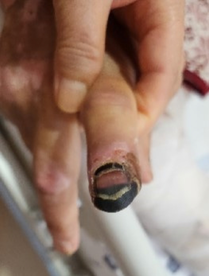 In this case, the patient experienced prolonged use of vasopressor agents due to severe hypotension secondary to shock. Norepinephrine is a catecholamine and a potent α1-adrenergic receptor agonist that increases vascular resistance by inducing vasoconstriction. It also acts as a β1-adrenergic receptor agonist, enhancing myocardial muscle fiber contractility and increasing heart rate. Norepinephrine is considered the first-line agent for hypotension in shock [10]. However, prolonged use has been associated with ischemic necrosis of peripheral tissues [11]. While the exact dosage and conditions leading to tongue necrosis remain unclear, vasopressor agents are recognized contributors to ischemic complications [3,12]. For this patient, vasopressin was additionally used. Vasopressin, first reported in 1926 [13], is an antidiuretic hormone that promotes water reabsorption in the kidneys and induces vasoconstriction, thereby increasing blood pressure. A meta-analysis report conducted in 2019 suggested that the use of vasopressin, either alone or in combination, is associated with a higher risk of digital ischemia compared to norepinephrine [14]. This patient had additional risk factors, including acute kidney injury (AKI) and DIC, both of which are known to increase susceptibility to peripheral ischemia, even at low-dose infusion [15]. Notably, this patient also developed inotrope-induced necrosis of the second finger, supporting the hypothesis that vasopressor therapy played a significant role.
