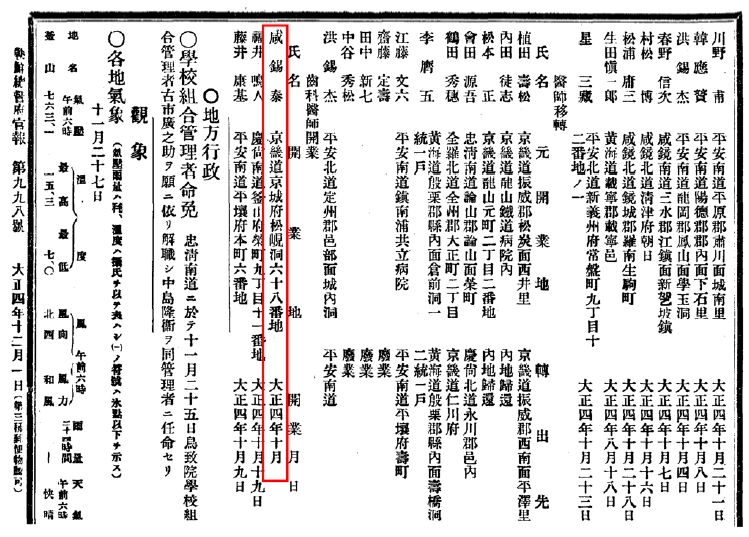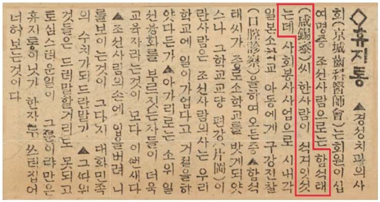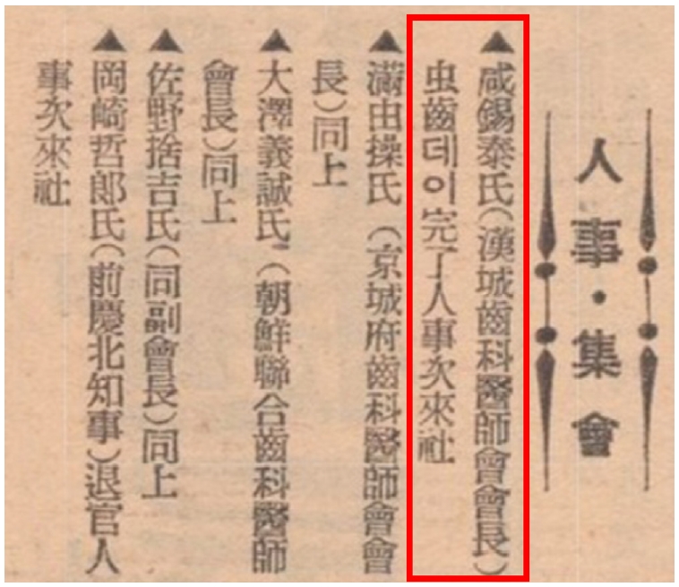 함석태 치과 터토선 함석태(1889~?)는 1914년부터 광복 때까지 경성부 삼각정 1번지에 함석태 치과를 개원하였다. 이곳이 바로 함석태 치과가 있었던 삼각정 1번지 주소의 일부분이다. 함석태 선생은 1912년 일본치과의학전문학교를 졸업하면서 한국인 최초로 치과의사가 되었고, 이곳에 한국인 최초로 치과를 개원하였다. 그는 일본인 치과의사들로 구성된 조선치과의사회에 대항하기 위해서 1925년 한성치과의사회를 창립하였고 초대회장을 지냈으며, 일제강점기 우리나라 국민들의 구강위생 계몽에 헌신하였다. 또한 일제강점기 문화재 지킴이 활동을 하면서 우리의 얼을 보존하는데 온 힘을 쏟았다. 안타깝게도 그는 1944년 소개령이 내려지자 자신의 수장품을 꾸려 고향인 평양북도 영변으로 잠시 머물다가 다시 경성으로 돌아오려 했으나 실패한 것으로 추정된다. 한국인 최초의 치과의사 함석태 선생은 대한민국 치의학 개척자, 일제강점기 대항과 구강위생 계몽의 선구자, 문화재 독립운동가로서 영원히 기억될 것이다. 일제강점기 한국인 최초의 치과의사인 함석태는 1914 년 경성에서 치과를 개원한 후 수많은 난관에 봉착했을 것이다. 조선 백성들의 치과 치료에 대한 인식 정도, 입치사(入齒師)들의 비윤리적인 진료행위, 구강위생 계몽을 하기 위한 척박한 현실과 같은 문제들은 유일한 조선인 치과의사 함석태가 해결해야 할 과제였다. 특히 입치사들이 어지렵혀 놓은 일반 국민들의 치과에 대한 인식을 바로잡는데 고군분투하였다. 1936년 만선지치계에 게재한 회고록에 입치사에 관한 일화가 내용의 절반을 차지할 정도로 그 당시 심각했던 것으로 보인다[1]. 경성에 돌아와 보니 일본 사람측은 고사하고 조선 사람측은 입치사 3-4명과 서양인의 닥터 한대위(韓大偉, 조선 성명으로 하여 치과를 경영함은 특히 조선 사회에 영합하는데 일대 광고술이라 할 수 있다)란 사람 등이 조선 사회의 상하는 통한 당면의 치과의사였다. 또한 입치사도 치과의사의 간판을 걸고 있는 혼돈 상태이다. 이런 이해 없는 배경하에서 약관표표 단신으로 내가 어떻게 대처할 것인가 걱정이 되지 않을 수 없었다. 즉 우리 사회에 조선 사람으로서 효시적 신사업을 위하여는 주소를 받지 않도록 당당한 것을 보여주어야 할 것이여, 또한 사회에 대한 인식을 환기하는데도 필요하고, 한편 금후의 동업자 즉 후진자의 전도를 열어주는데도 책임이 있으므로 한다면 훌륭히 하지 못해도 빈약하게는 하지 않겠다는 두 가지 정반대의 분기점에서 방황하고 있을 무렵 재미있는 하나의 에피소드가 있었다. 이 이야기가 옆길로 들어갈는지 모르지만 한 토막의 말로써 당시 사회의 치과에 대한 지식의 단면을 소개하게 되므로 잠깐 언급하고자 한다. 앞에서 말한 대로 당시 3-4명의 입치사 중의 한 사람으로 남대문통 1정목, 지금의 동일은행 옆에 한성치과의원이란 간판을 걸고 당당히 조선귀족사회와 일반 상류층을 단골로 하고 있던 입치사로서 박교상(朴敎祥)이란 청년이 있었는데 1913년(대정2) 10월경에 총독부에서 조선의사법 치과의사법을 제정하여 1914년(대정3) 1월 1일부터 실시한다는 법령을 공포했다. 이에 따라서 입치영업자가 의원의 간판을 내걸지 못하게 되자 박교상은 서양인 기독교 목사를 의지하여 치과의사 자격을 얻는 목적으로 입치영업을 그만두고 서양으로 갔다. 1914년 매일신보에 실린 함석태 치과 광고 문구에 그의 고민이 담겨 있다(Fig. 9). ‘수술무료’는 일제강점기 입치사들과 경쟁해야 했던 전문직 치과의사의 고뇌어린 결단으로 판단된다. 그럼에도 불구하고 함석태는 구강위생 계몽을 위해 한 걸음 한 걸음씩 내닫기 시작하였다. 일본의 식민 지배에 저항하기 위하여 전 민족이 일어난 3.1 운동이 발생한 1919년 7월 매일신보에 실린 ‘구강위생에 대한 주의’라는 함석태 칼럼이 우리나라 최초의 구강위생에 관한 칼럼으로 보인다[3]. 함석태는 일제강점기 백성들이 치과에 대하여 어떻게 생각하였는지, 치아가 얼마나 중요한지에 대해서 강조하였다. 또한 칫솔의 사용 및 보관법에 대해서도 자세한 설명이 이어진다. 동아일보 1924년 2월 11일 칼럼에 의하면 함석태는 일본인 학생들이 다니는 심상소학교에 촉탁의로 지명되어 구강검사를 시행하였다. 다시 말하면 지난 수년 동안 구강검진이 연례행사이었을 알 수 있다. 그런데 1925년 3월 종로소학교 교장인 편강(片岡)이 함석태가 일본인 학생들을 검진하는 것을 허용할 수 없다며 거절하는 사건이 발생하였다. 동아일보 3월 21일 기사는 일본인 교장의 이러한 행위를 강하게 비판하였다(Fig. 10). 조선일보 기사에 따르면 의사의 신성을 무시하고 편강 교장이 함석태 구강 검진의 촉탁을 거부함에 따라 함석태는 다른 일본인 치과의사와 촉탁의를 교환하여 서대문소학교에서 구강 검진을 하게 되었다[4]. 조선일보 1925년 3월 23일 조선일보 1면에 ‘기괴한 우월감’이라는 짧지만 강력한 기사가 실렸다[5] 1930년 8월 10일 조선일보에 실린 ‘가정에서 알어야 할 니병과 니에 위생’이라는 칼럼에서 청년 함석태 선생의 사진을 발견하였다(Fig. 11). 그토록 함석태 선생의 사진을 찾