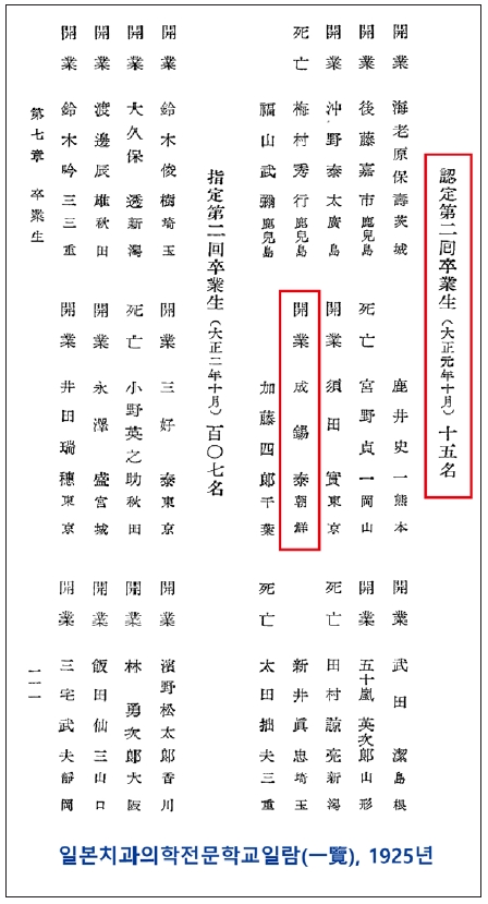 함석태가 졸업한 일본치과의학전문학교는 사립으로 1907년 설립되어 처음에는 공립치과의학교로 발족했다가 1909년 6월 1일 일본치과의학교로 변경되었고, 1909년 8월에는 제반 시설을 확충하고 전문학교령에 따라 전문학교로 승격되었다(Fig. 1). 1909년 8월 전문학교령에 의해 일본치과의학전문학교 수업연한도 종래 2년에서 3개년 과정으로 연장되었다. 일본 치과의학전문학교의 2년 과정을 마친 학생 16명은 1911년 인정 제1회로 졸업하였다. 전문학교로 지정되어 1년 과정을 더 수업한 학생 54명은 1912년 지정 제1회 졸업생이 되었고, 함석태는 2년 과정을 마치며 일본치과의학전문학교를 1912년에 졸업하였다(Fig. 2). 1912년 인정 제2회 졸업생은 15명이고, 함석태와 함께 입학했던 107명은 1년 더 수업을 받은 후 1913년 지정2회로 졸업하였다. 함석태는 1936년 치과잡지 만선지치계에 게재한 회고록에서 밝혔듯이 처음에는 일본에서 전공으로 이비과(耳鼻科)를 전공하려 하였으나, 계획을 변경하여 조선의 치과계 발전을 위해서 1913년 12월 고국으로 돌아왔다[1]. 함석태는 다음과 같이 회고했다. 내가 학교를 졸업한 것은 1912년(大正元年)이었는데 재학 당시는 누구나 다 같은 심리겠지만 특히 당시 조선에서 머나먼 일본에 유학이라도 하는 유학생의 심리는 학문을 마치고 소위 금의환국(錦衣還國)한다는 하나의 공명심은 아마 상상하고도 남을 것 같다. 그런데 조선 사회를 살펴본 즉 치과의학에 대한 지식은 거의 없고 가령 개업을 해도 아무런 이해(理解)가 없는 일이라면 마치 10년 공(功)도 일실(一實)에 귀(歸)하는 격이라서 여러 가지 생각 끝에 차라리 치과와 밀접한 관계를 갖는 이비과(耳鼻科)를 또 하나 전공하고 돌아가면 하는 마음으로 동경을 떠나지 않고 있었는데 교장을 비롯 선배들이 말하기를 옛날의 일본과 현재의 조선과는 치과의 발전 상태가 완전히 일치하고 있으므로 이런 의미에서 조선은 장래가 유망하니까 걱정하지 말고 빨리 돌아가서 개업하라는 격려를 받아 용기백배하여 1913년(대정2) 세모에 귀국했다. 1925년 일본치과의학전문학교에서 펴낸 일람에 나온 학교 교사 전경의 모습을, 박슬기 작가에 의해 더욱 멋지게 복원된 그림이다(Fig. 3). 현재 일본치과대학은 도쿄와 니카타(Niigata)에 각각 2개의 치과대학이 있으며, 재학생은 2000명, 교수는 1000명이다. 지금까지 22,152명의 치과의사를 배출하여 일본에 있는 치과의사 7명중에 한 명이 일본치과대학 동문이다. 2025년 4월 대한치과의사학회 임원진은 함석태 선생의 발자취를 찾아 일본 치과대학을 방문하였다(Fig. 4). 그에 관한 어떤 정보도 발견하지 못했지만 뜻깊은 행사였다. 함석태는 1914년 2월 5일 조선총독부 치과의사 면허번호 1번으로 등록하였다(Fig. 5). 이 치과의사 면허는 1913년 조선총독부령으로 치과의사규칙이 반포된 후 한국에서는 최초의 치과의사로 등록된 것이다. 그는 경성 삼각정 1번지에 2층 목조 건물(지하 1층)을 짓고 1914년 함석태 치과를 개원하였다. 1914년부터 1935년까지 함석태 치과 신문 광고에 의하면 그는 계속 삼각정에서 개원을 했던 것으로 보인다(Fig. 6). 함석태는 1924년 2월 11일 동아일보에 개원 당시 한국의 치과적 상황을 자세하게 설명하였다. 그는 조선인 12명의 치과의사가 개원하였으나 존속하지 못할 정도로 그 당시 우리나라 국민들의 치과에 대한 인식이 부족하였음을 한탄하였다. 이처럼 열악한 환경에서도 함석태는 자기 영업 즉 치과 개원생활 이외에도 사회에 봉사할 수 있는 어떤 것을 해야 한다는 것을 강조하였다. 또한 일본인 학생들이 다니는 심상소학교에는 자신을 포함한 일본인 치과의사 수십명이 촉탁의로 선정되어 구강 검사를 시행하고 있는데, 조선인 학생들이 있는 보통학교에는 이러한 구강 검진이 행해지지 않고 있는 점에 안타까워하고 있다[2]. 지금으로부터 10년 전 1914년(대정 3년)에 본인이 개업할 당시에 경성에 일본인 치과의사가 4인이요. 조선인측으로 본인이 1인 이든바 10년 후인 1924년에 이르러서는 일본인은 21인이 되고, 조선인은 역시 1인에 불과하오니 참으로 안타깝고 기이한 할 일이 아니오니까. 무릇 조선측으로도 이 기간에 12인의 개업자가 있었으나 어찌 되었든 간에 존속(存續)하지 못하는 것을 보면 우리 사회의 구강위생 사상의 정도를 알 수 있는 것이다. 경성에 거주하는 일본인의 수를 조선인에 비하야 대략 4분의 1이나 3분의 1이라고 가정하면 소수의 인구로 능히 20인 이상의 치과의사를 용납하는데 조선인은 그것의 4분의 1이나 3분의 1이상의 다수로서 오히려 23인의 치과의사 문호를 유지하지 못하는 그것이 즉 무엇을 의미합니까? 또 우리의 발전상으로 우리의 10년간이라 하면 선진자인 그들의 100년간에나 상당하다고 할 만한 이 다사다난한 10년 안에 우리가 20인이나 늘었다하면 거의 순조로운 향상 발전이라 할지 모르나 도리어 10년 전 1인은 역시 10년 후에 1인에 불과하오니 정말로 비탄(悲嘆)을 금치 못하겠습니다. 일본인 동업자는 항상 본인을 향하야 자네는 독무대이니까 좋으리라고 칭찬합니다만 이 독무대야말로 무슨 의미의 독무대입니까? 잠깐 대답하기 거북합니다. 