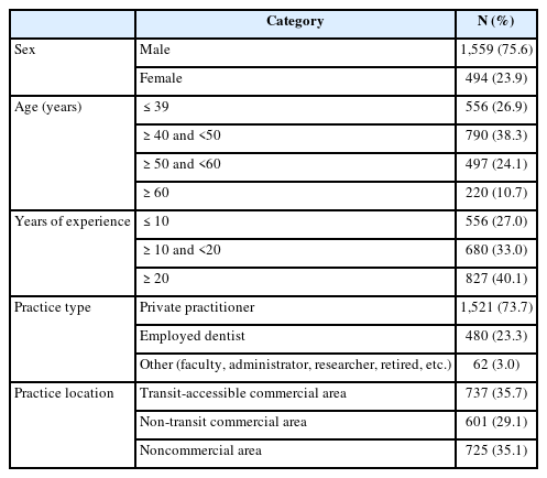 설문에 응답한 대상자는 여성보다 남성이 1,559명(75.6%)으로 많았고, 연령은 만 40-49세가 790명(38.3%), 만 39세 이하가 556명(26.9%) 순으로 높았다. 경력은 20년 이상이 827명(40.1%)로 가장 많았고, 응답자의 대부분은 개원의(1,521명, 73.7%)였다. 근무위치는 역세권 상업지역이 737명(35.7%), 비상업지역이 725명(35.1%), 비역세권 상업지역이 601명(29.1%)으로 비교적 고르게 분포하였다.