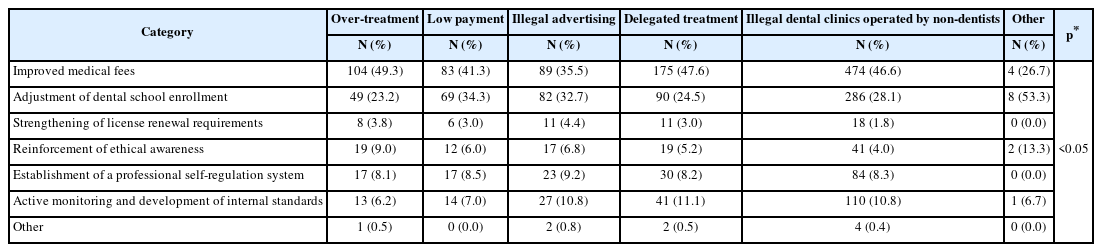 “Illegal dental clinics operated by non-dentists” were identified as the most serious unethical practice (49.3%), and “license revocation” (48.3%) was viewed as the most appropriate disciplinary action. Other miscon-ducts, such as delegated treatment, over-treatment, and illegal advertising, were primarily associated with “license suspension.” As for improvement strategies, “Improved medical fee” (45.0%) and “adjusting dental school enroll-ment” (28.3%) were the most frequently cited. Significant associations were found between perceived misconduct types and preferred disciplinary actions and reforms (p<0.05).