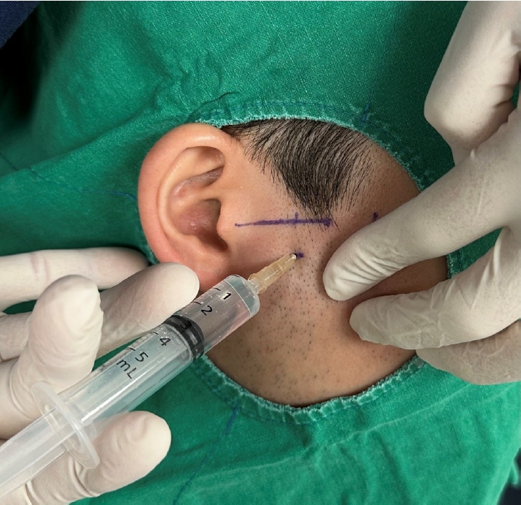 A reference line (mid trago-canthal line) is established by connecting the midpoint of the tragus and the lateral canthus. The injection point is determined to be 20 mm anterior and 10 mm inferior to the tragus along this line.