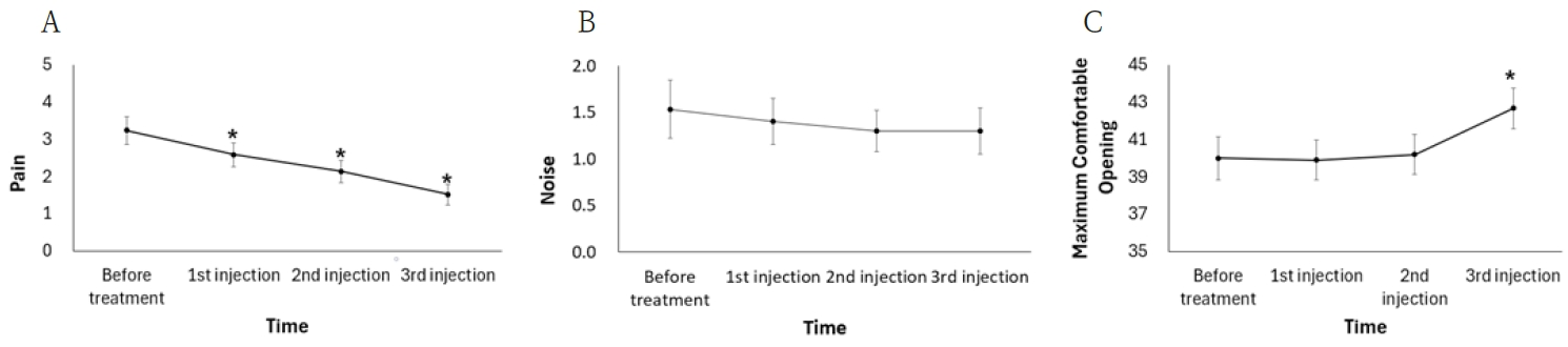 모든 회차에서 술 전보다 턱관절 통증이 점차 감소하였다. VAS 점수에 따르면 술 전 3.2±2.1에서 1회차 후 2.6±1.8, 2회차 후 2.1±1.7, 3회차 후 1.5±1.5로 모든 회차에서 술 전 VAS 점수에 비해 통계적으로 유의한 감소가 확인되었고 술 전에 비해 3회차 후 통증이 53% 감소하였다(Fig. 2, Table 2).