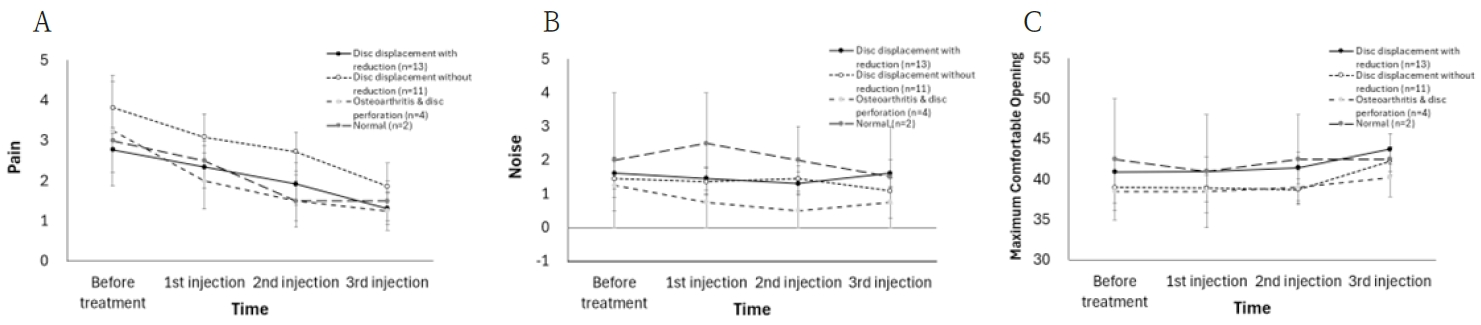 통증, 관절잡음, 무통성최대개구량의 각 다른 진단의 그룹간 비교에서는 통계적으로 유의한 차이를 보이지 않았다. 술 전에 비하여 회차가 지날수록 각 진단 그룹 간의 차이 없이 통증 및 관절잡음은 감소추세를 보였고 무통성최대개구량은 증가추세를 보였다(Fig. 3).
