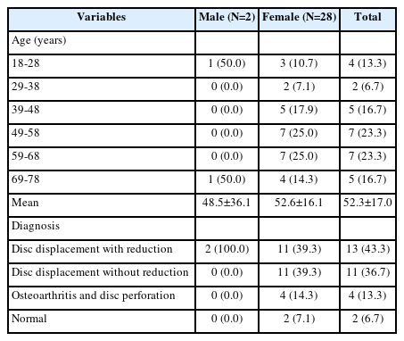 환자 30명 중 여성이 28명, 남성이 2명이었으며, 평균 연령은 52.3±17.0세였다(Table 1). 모든 환자는 큰 합병증 없이 프롤로테라피 주사치료를 받았다. 일부 환자에서 주사로 인한 시술 후 통증을 호소하였으나, 진통제인Acetaminophen 복용 후 수일 이내에 자연 소실되었다.