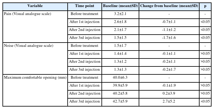 술 전에 비해 시술 후 관절잡음의 감소는 유의하지 않았다. 그러나 VAS 평균수치를 보면 술 전1.5±1.7에 비해 1회차 후 1.4±1.4, 2회차 후 1.3±1.2, 3회차 후 1.3±1.3으로 관절잡음이 점차 감소하는 경향을 나타냈고 술 전에 비해 3회차 후 관절잡음이 13% 감소하였다(Fig. 2, Table 2).