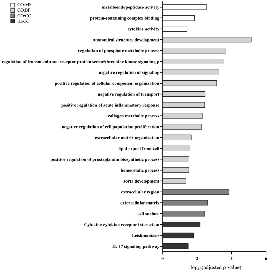 Functional enrichment analysis was conducted using g:Profiler (version e113_eg59_p19_f6a03c19, https://biit.cs.ut.ee/gprofiler/). Analyses included Gene Ontology (GO) categories — Molecular Function (MF), Biological Process (BP), and Cellular Component (CC) — and Kyoto Encyclopedia of Genes and Genomes (KEGG) pathways. Significance was determined using the g:SCS-adjusted p-value provided by g:Profiler, with values < 0.05 considered significant.