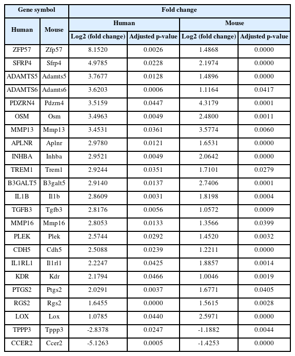 However, there were limitations in that this study utilized publicly available datasets from GEO, and the sample sizes for both mouse and human data were relatively small. In addition, because the datasets were derived from independent studies, the number of samples differed between species. Future studies with larger and more balanced sample sets are warranted to validate the cross-species comparisons. Moreover, it is important to assess whether this varies with the method and duration of periodontitis induction, to develop more relevant mouse models. In particular, comparative studies with other induction methods, such as lipopolysaccharide injection or models induced by periodontal pathogens like Porphyromonas gingivalis, are needed to further clarify their translational relevance. Also, there is a need to verify whether the conserved periodontitis-related DEGs identified in this study are consistently observed across different datasets and to clarify their specific roles in the pathogenesis of periodontitis. This study would serve as a starting point for such efforts and contributes to a fundamental understanding of the molecular mechanisms involved in the onset and progression of periodontitis.