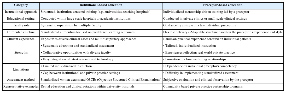 공식적인 치의학 교육 체계는 1840년 미국 볼티모어 치과대학(Baltimore College of Dental Surgery)의 설립을 기점으로 본격적인 기틀을 마련하였다[9]. 19세기 후반에 이르러 치의학계 내에서는 과학적 이론과 임상 기술을 통합적으로 가르치는 대학 기반 모델(institutional model)과, 실제 환자 진료를 통한 실무 경험을 강조하는 전통적 도제식 모델(preceptor model) 사이의 철학적 대립이 치열하게 이어졌다[10,11]. 이 두 교육 모델의 주요 차이점은 Table 1에 정리되어 있다. 도입 초기에는 비용 효율성과 지역적 접근성이 뛰어난 도제식 교육이 우위를 점했으나, 1860년대 이후 미국치과의사협회 (American Dental Association)가 교육의 표준화를 강력히 추진하면서 1867년 하버드대학교에 최초의 대학 기반 치의학 교육 과정이 안착되었다[12]. 하지만 19세기 말 교육 기관의 급증으로 인한 무분별한 면허 허용 등 질적 저하 문제가 불거지자[13], 20세기 초 주 정부는 법적 규제를 강화하여 공인된 대학 졸업자에게만 면허 시험 응시 자격을 부여하기 시작했다[14]. 이러한 제도적 정비는 비표준화된 사설 교육 기관들을 자연스럽게 퇴출시켰으며, 결과적으로 대학 중심의 정규 치의학 교육 시스템이 확고한 표준으로 자리 잡는 결정적인 토대가 되었다.