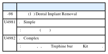 따라서 이 시기에는 임플란트를술에 대하여, 간단하게 포셉으로 제거하는 경우에는 전치단순발치술 또는 구치단순발치술 등 식립된 임플란트의 위치에 따라 보험항목을 적용하였으며 버(bur)등으로 골삭제를 하면서 제거하는 경우에는 난발치 항목을 적용하고 버값(6,980원)을 청구하는 방식을 임상에서 사용하였다. 이후 2014년 7월 1일 임플란트 관련 항목(제거술, 치과건강보험적용기준)들이 신설되고(Table 1) [4], 후유증 인정기준에 대한 심사지침이 변경되었다(Table 2).