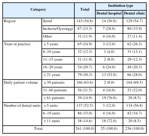 The general characteristics of the study participants are shown in Table 1. The region distribution was 54.8% in Seoul, 33.3% in Incheon/Gyeonggi, and 11.9% in other areas. Regarding the duration of practice, 30.3% had been in practice for over 21 years, and 24.9% for 5 years or less. In terms of patient volume, 63.6% treated 30 or fewer patients per day, and 52.5% had five or fewer dental units.