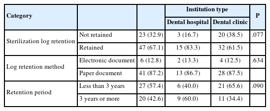 Regarding sterilization log creation, 26.8% of respondents reported that they keep such records. Among them, 72.0% of dental hospitals and 22.0% of dental clinics reported doing so, with a statistically significant difference (p<0.05). For sterilization log management, 24.5% reported that they manage it, with dental hospitals at 72.0% and dental clinics at 19.5%, showing a statistically significant difference (p<0.05). Regarding sterilization log retention, the overall rate was 67.1%, with 83.3% for dental hospitals and 61.5% for dental clinics, also showing a statistically significant difference (p<0.05).