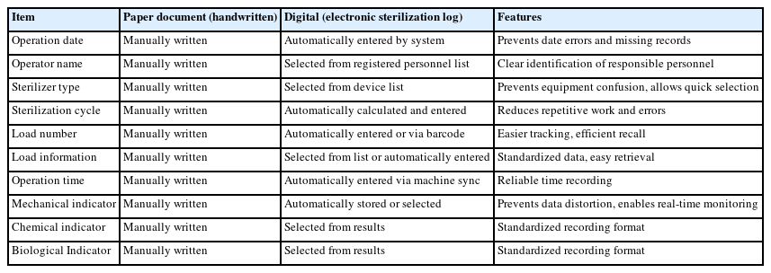Table 5 compares the sterilization log recording items recommended by the Ministry of Health and Welfare’s standard manual between paper-based (manual) and computerized (electronic sterilization log) methods. This comparison confirms the superiority of computerized methods in terms of recording efficiency and accuracy.