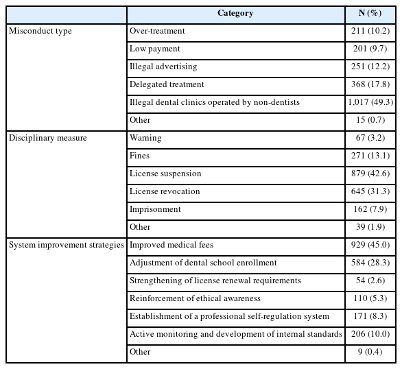 An online self-administered survey was distributed to 28,949 members of the Korean Dental Association, and responses from 2,063 dentists were included in the final analysis. The questionnaire cov-ered demographic characteristics, types of misconduct, preferred disciplinary levels, and opinions on systemic improvements. Frequency and chi-square analyses were conducted.