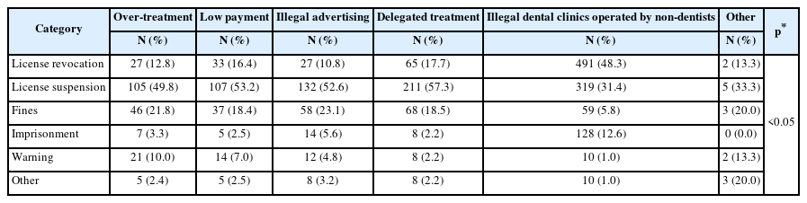 “Illegal dental clinics operated by non-dentists” were identified as the most serious unethical practice (49.3%), and “license revocation” (48.3%) was viewed as the most appropriate disciplinary action. Other miscon-ducts, such as delegated treatment, over-treatment, and illegal advertising, were primarily associated with “license suspension.” As for improvement strategies, “Improved medical fee” (45.0%) and “adjusting dental school enroll-ment” (28.3%) were the most frequently cited. Significant associations were found between perceived misconduct types and preferred disciplinary actions and reforms (p<0.05).
